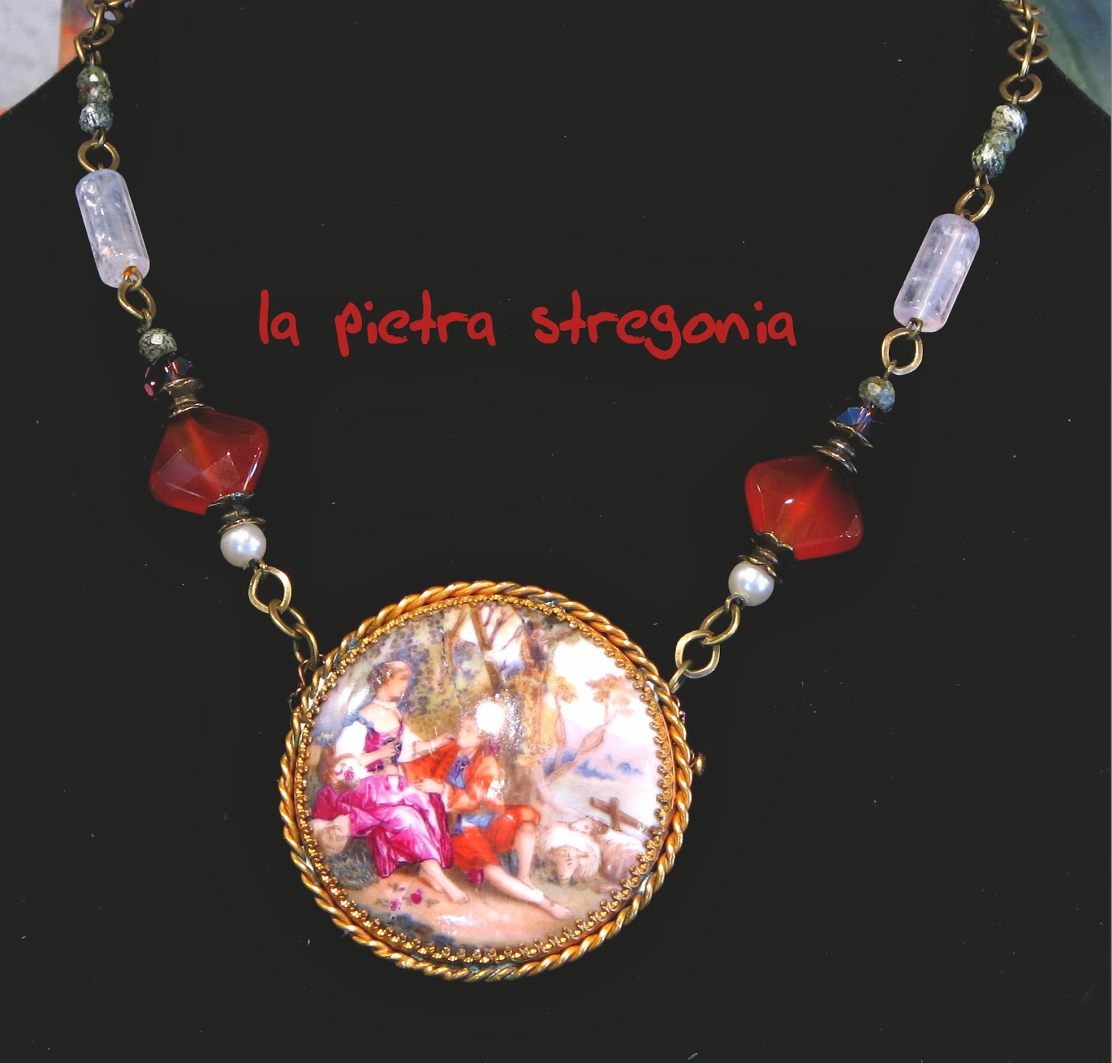 Questa collana è realizzata proprio con una di queste meraviglie, si tratta di un piccolo portamonete ricoperto di centinaia di perline grandi come capocchie di spillo che formano un raffinato disegno floreale. L'interno, in perfetto stato, è rivestito in camoscio, la catena antica, che viene dalla Germania, può essere utilizzata anche con altri pendenti grazie al moschettone da orologio (vittoriano) sormontato da alcuni piccoli frutti che ho realizzato con agata fuoco, perline antiche e fogliolina in vetro di Murano per riprendere i colori del borsellino.