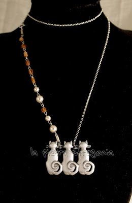 Tre gatti che non danno confidenza ci voltano le spalle appesi ad una collana realizzata con una lunga catenina d'argento con perle e corniole prese da una collana degli anni '60 . I mici in incognito sono una spilla JJ anni '70/ '80 in peltro. Anche questa sarà sabato 31 ottobre e domenica 1 novembre a MercatoMonti.