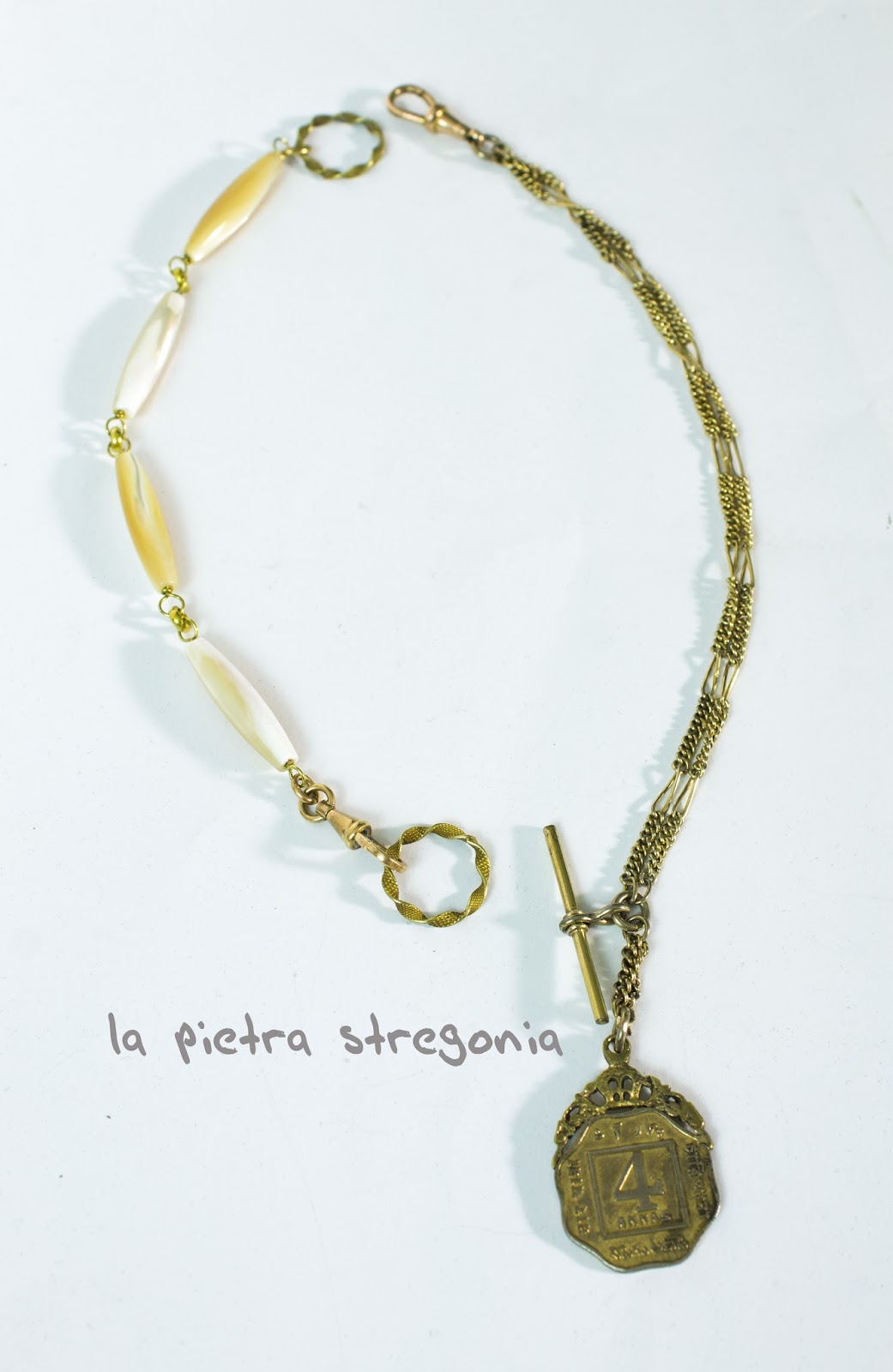 Questa volta ho trovato uno oggetto molto raro, un'intera catena da orologio placcata oro risalente al 1919 con medaglia indiana coniata in onore dell'imperatore britannico Giorgio V. Un pezzo come questo, sicuramente ambito dai collezionisti, andava lasciato così com'era, per questo motivo ho creato una collana (quasi un girocollo) completamente smontabile collegando con moschettoni e piccoli anelli da tende in ottone (tutto dell''800) le lunghe perle in madreperla alla catena da orologio.